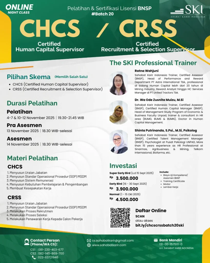 Sertifikasi Certified Human Capital Supervisor (CHCS) & Certifed Recruitment & Selection Supervisor (CRSS) yang dikeluarkan oleh Badan Nasional Sertifikasi Profesi (BNSP) merupakan pengakuan resmi terhadap kompetensi profesional di bidang pengelolaan sumber daya manusia (SDM). Sertifikasi ini dirancang untuk memastikan bahwa para supervisor di bidang human capital dan bidang recruitment & selektion memiliki pengetahuan, keterampilan, dan sikap yang sesuai dengan standar industri, sehingga mampu menjalankan tugas-tugas pengawasan dan pengembangan SDM dengan efektif. Melalui sertifikasi ini, individu diharapkan dapat meningkatkan kualitas manajemen SDM di perusahaan, yang pada akhirnya akan berkontribusi terhadap peningkatan kinerja organisasi secara keseluruhan.