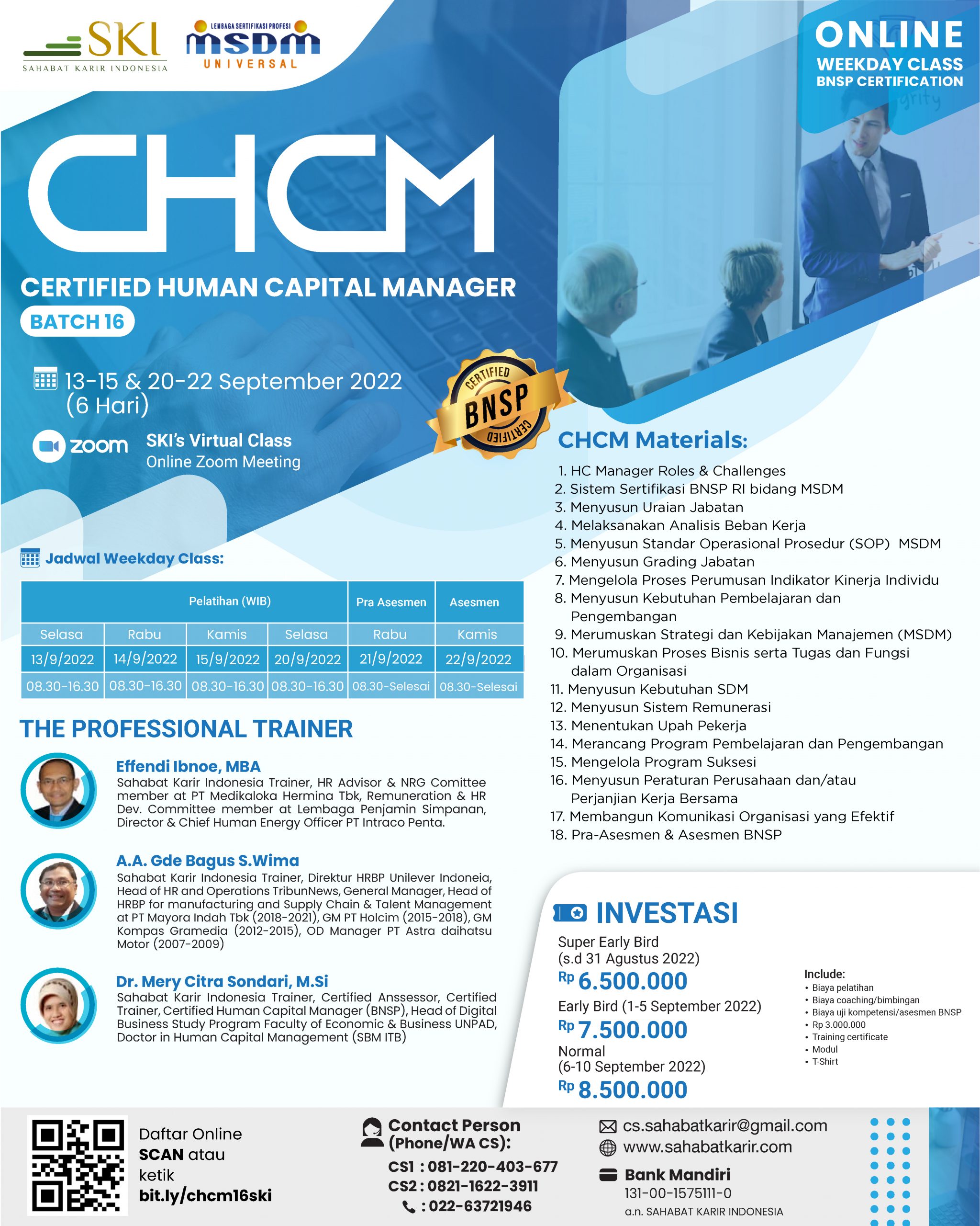 ONLINE  Weekday Class Training CERTIFIED HC MANAGER (CHCM)  #Batch16 – BNSP