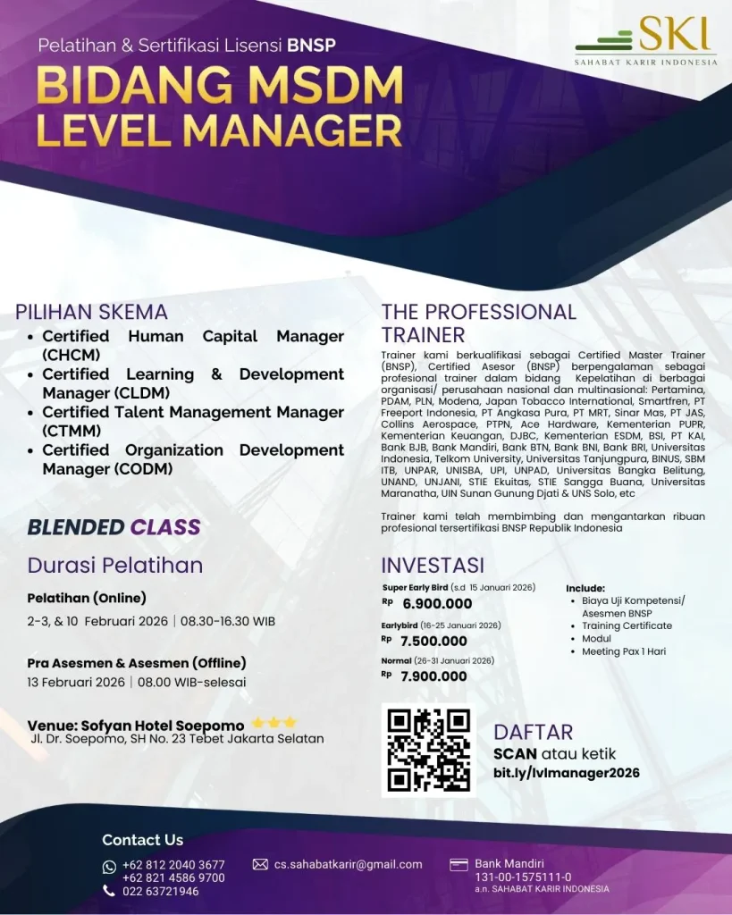 Sertifikasi Level Manajer yang dikeluarkan oleh Badan Nasional Sertifikasi Profesi (BNSP) merupakan pengakuan resmi terhadap kompetensi profesional di bidang pengelolaan sumber daya manusia (SDM). Sertifikasi ini dirancang untuk memastikan bahwa para Level Manajer di bidang human capital memiliki pengetahuan, keterampilan, dan sikap yang sesuai dengan standar industri, sehingga mampu menjalankan tugas-tugas pengawasan dan pengembangan SDM dengan efektif. Melalui sertifikasi ini, individu diharapkan dapat meningkatkan kualitas manajemen SDM di perusahaan, yang pada akhirnya akan berkontribusi terhadap peningkatan kinerja organisasi secara keseluruhan.