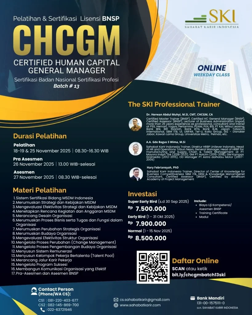 Sertifikasi Certified Human Capital General Manager (CHCGM) yang diselenggarakan oleh Badan Nasional Sertifikasi Profesi (BNSP) merupakan pengakuan resmi terhadap kompetensi dan keahlian individu dalam mengelola sumber daya manusia pada tingkat manajerial. Sertifikasi ini bertujuan untuk memastikan bahwa para profesional di bidang manajemen SDM memiliki kemampuan strategis dalam merancang, mengimplementasikan, dan mengawasi kebijakan serta praktik SDM yang efektif dan sesuai dengan standar nasional. Sertifikasi ini juga memperkuat kredibilitas dan daya saing individu dalam dunia kerja, terutama bagi mereka yang ingin menempati posisi kunci dalam pengelolaan sumber daya manusia di perusahaan atau organisasi